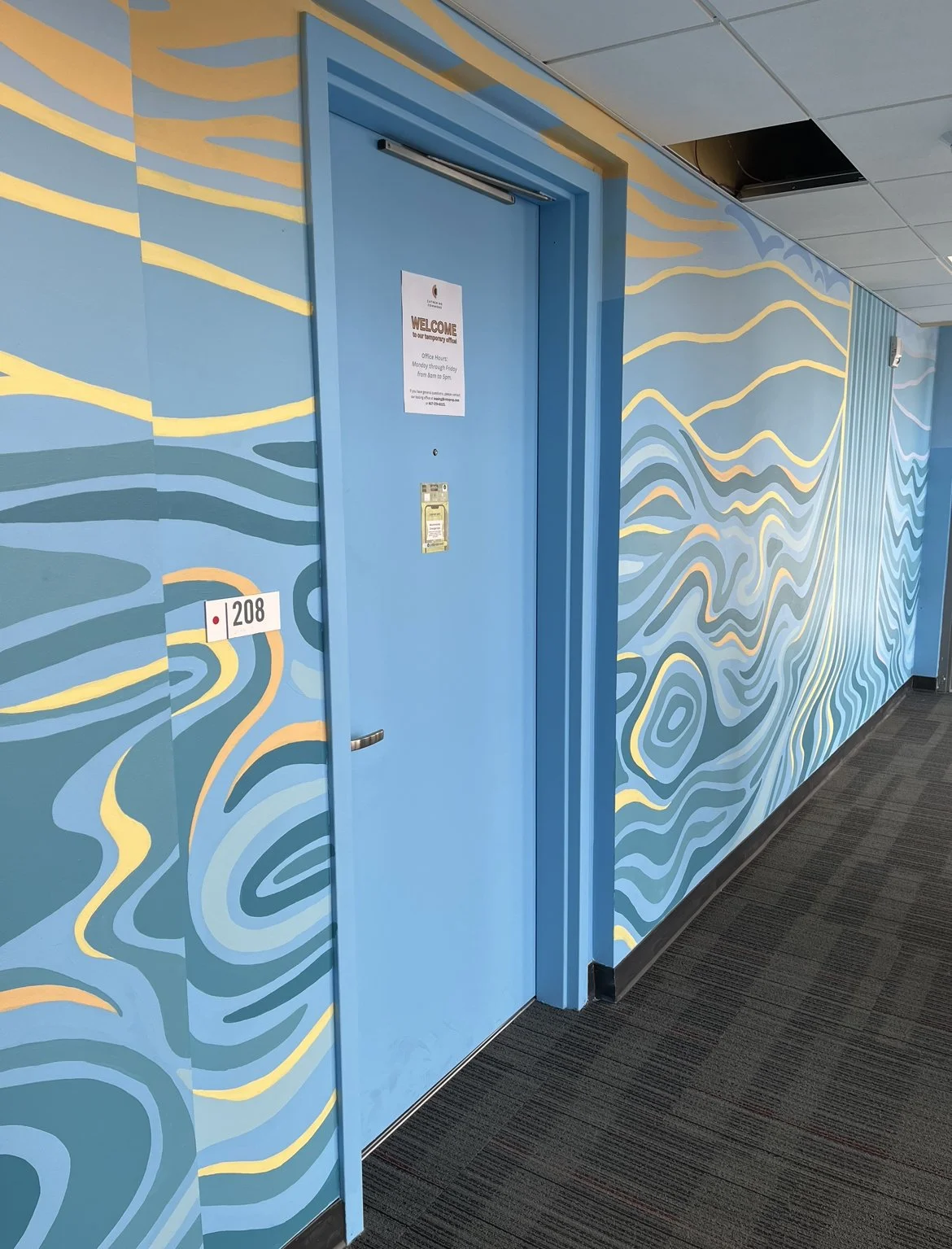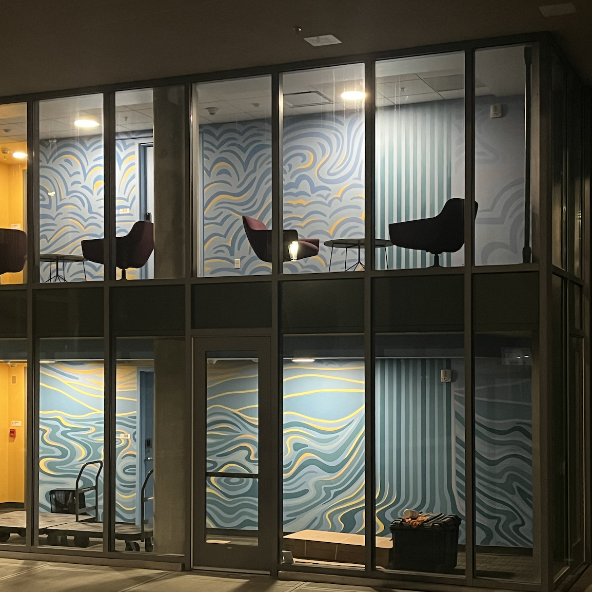 A commissioned mural project. Completed in a two-story college town apartment building with glass windows enabling an illuminated view from the street, this piece is an abstract interpretation of Cayuga typography, nature, and waterfalls.