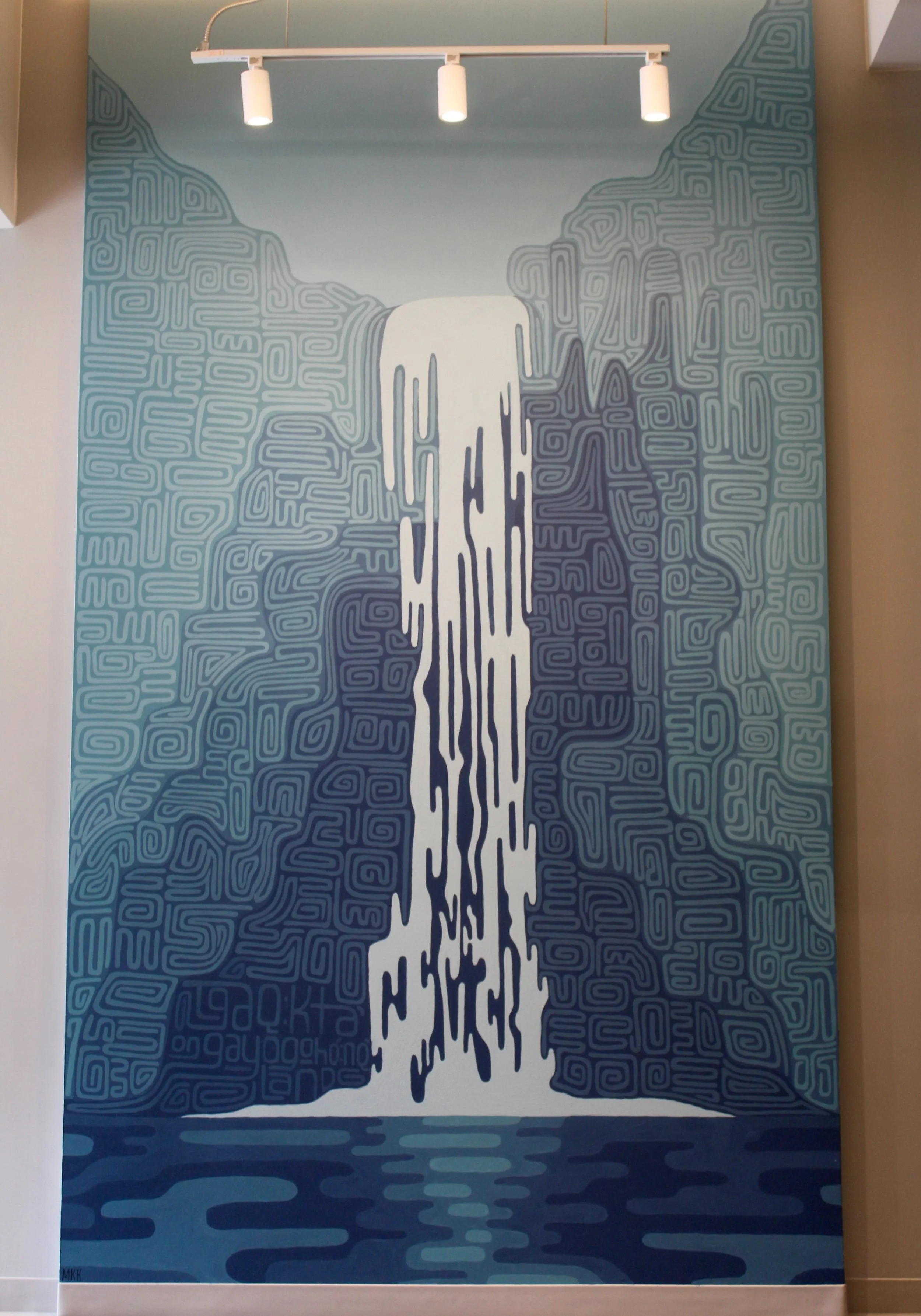A commissioned piece inside Ithaca’s Chamber of Commerce. An artistic representation of the local waterfall, Taughannock, this mural includes a land acknowledgment to the Cayuga people with blessings from two chiefs, continuing my artistic investigation into art, heritage, and culture.